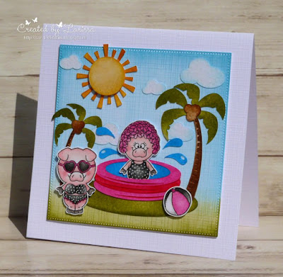 My card from today is a pretty easy one, but because of all the colouring I had to do, it took a while to finish. On a piece of white cardstock I stamped a couple of sunbathing piggies from tehe stamp set