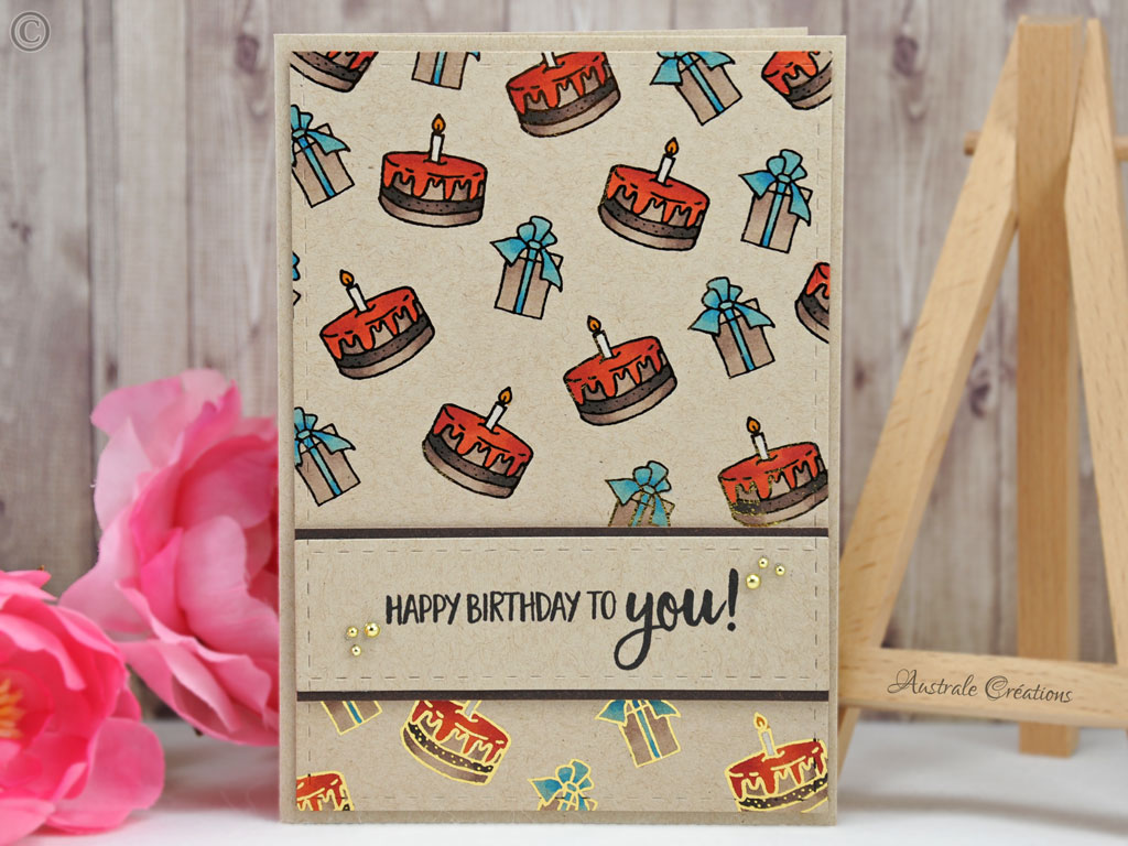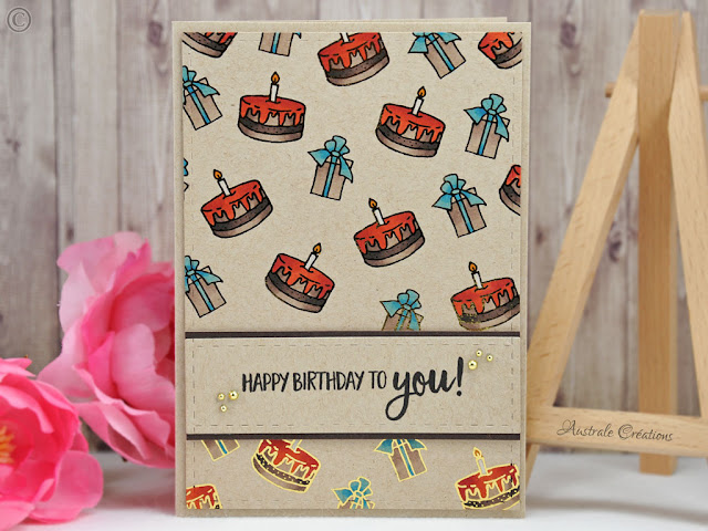 For the card, I wanted the animals to look like they were peeking out. So I stamped, colored and fussy cut the animals from the set then paper pieced the gift and cake, also...