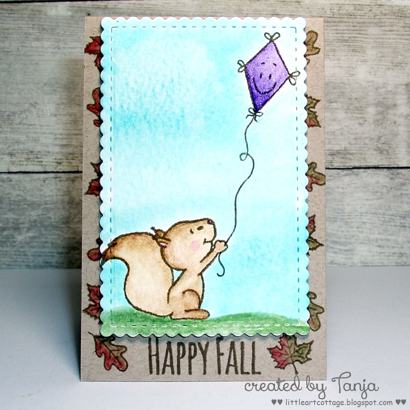 mask the squirrel and create a background using Distress Inks (Antique Linen, Frayed Burlap, Tumbled Glass, Salty Ocean) and the Hero Arts Cloudy stencil