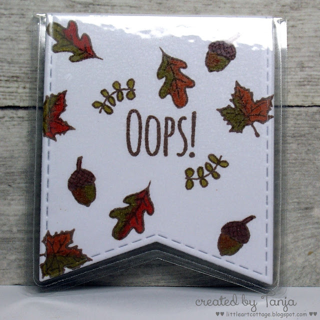 stamp the squirrel from Gerda Steiner Designs Happy Fallonto the front and the "Oops" sentiment and some leaves from the same set on the backside of the bookmark...