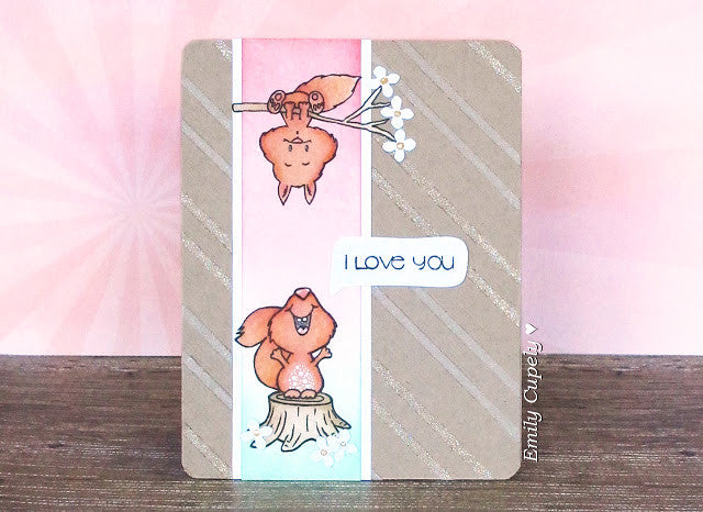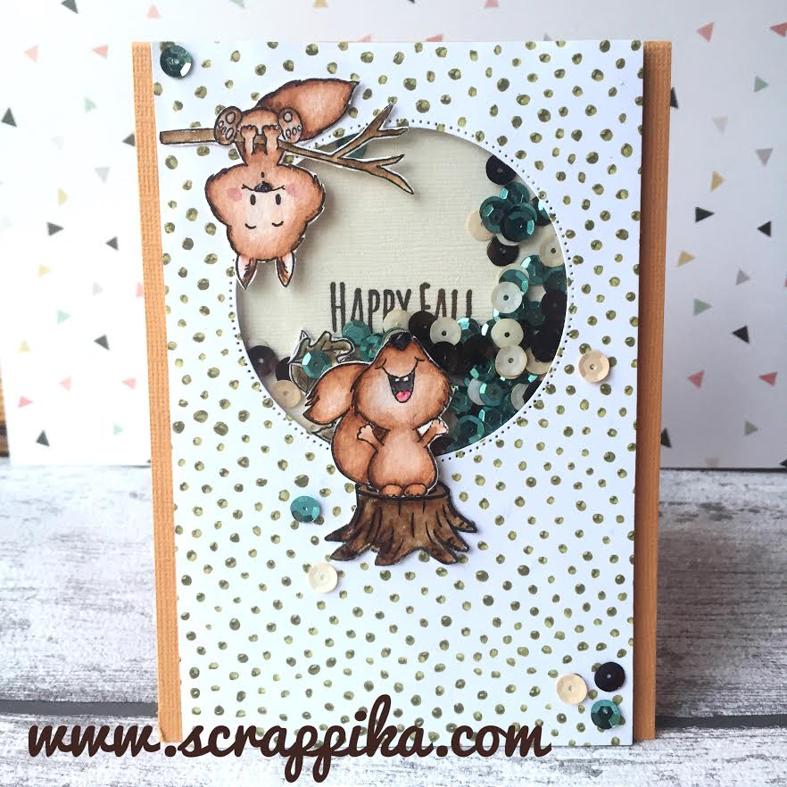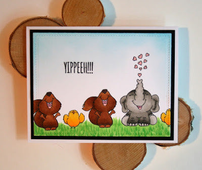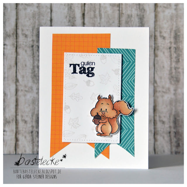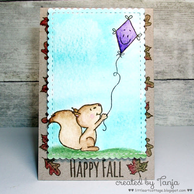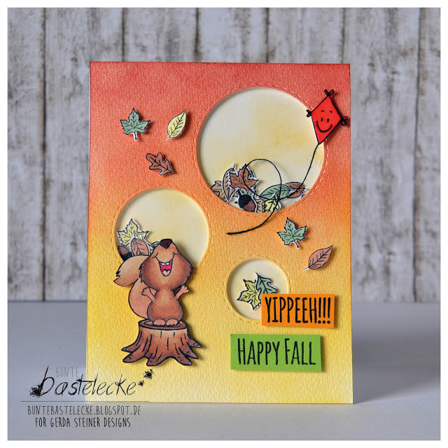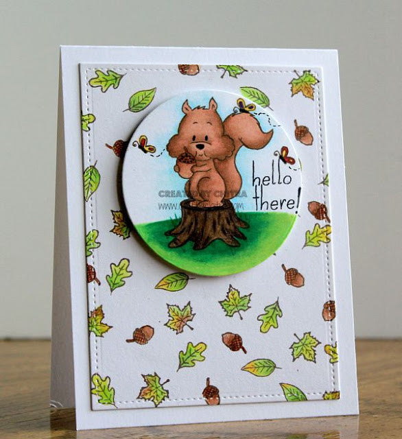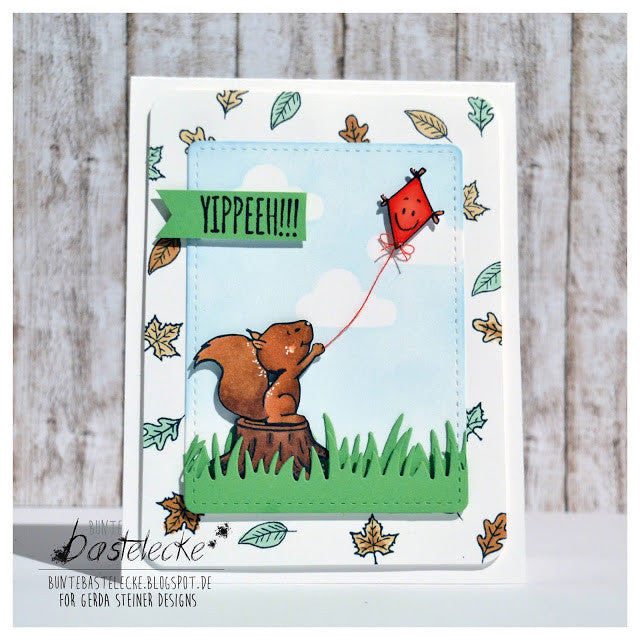 These cute Squirrel Clear Stamps give you lots of possibilities to create lots of Fall scenes and also everyday cards. The sentiments match perfectly and the ideas are endless. Make the squirrel sing with the music notes or he can throw some leaves and squeal YIPEEH ...